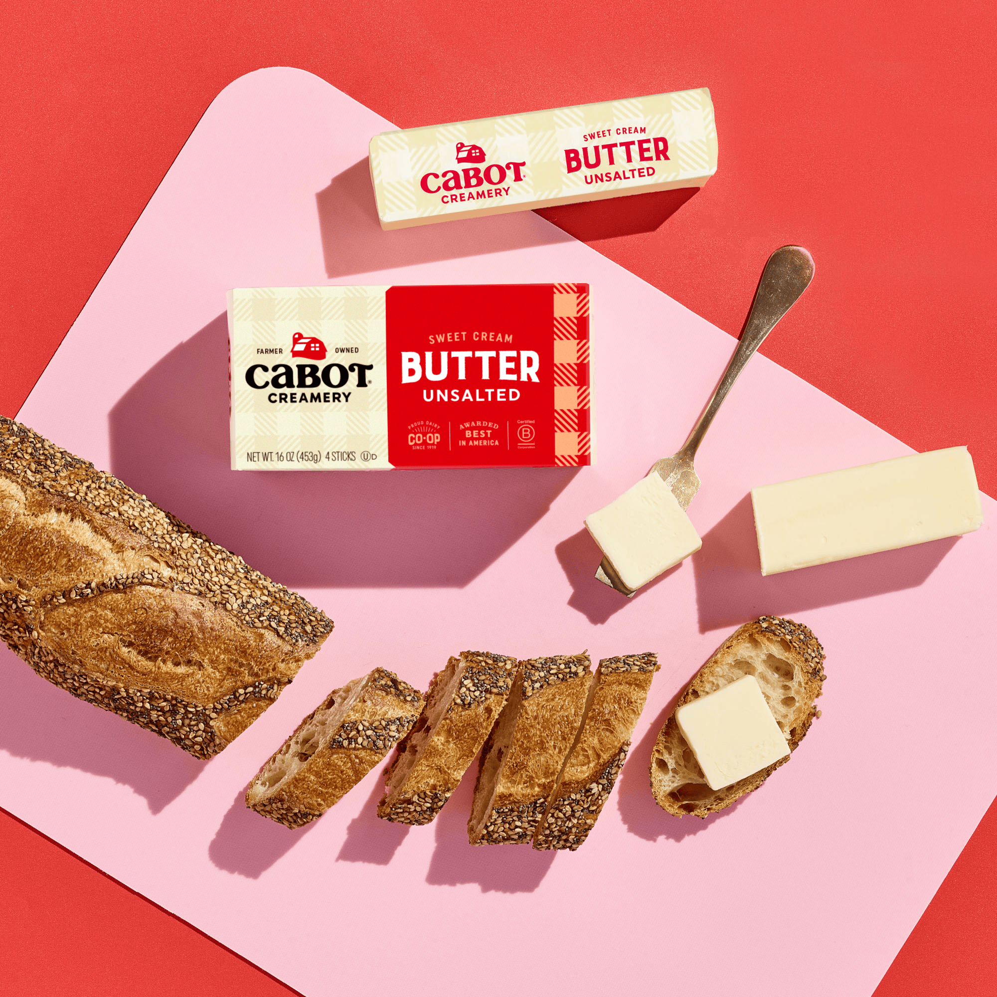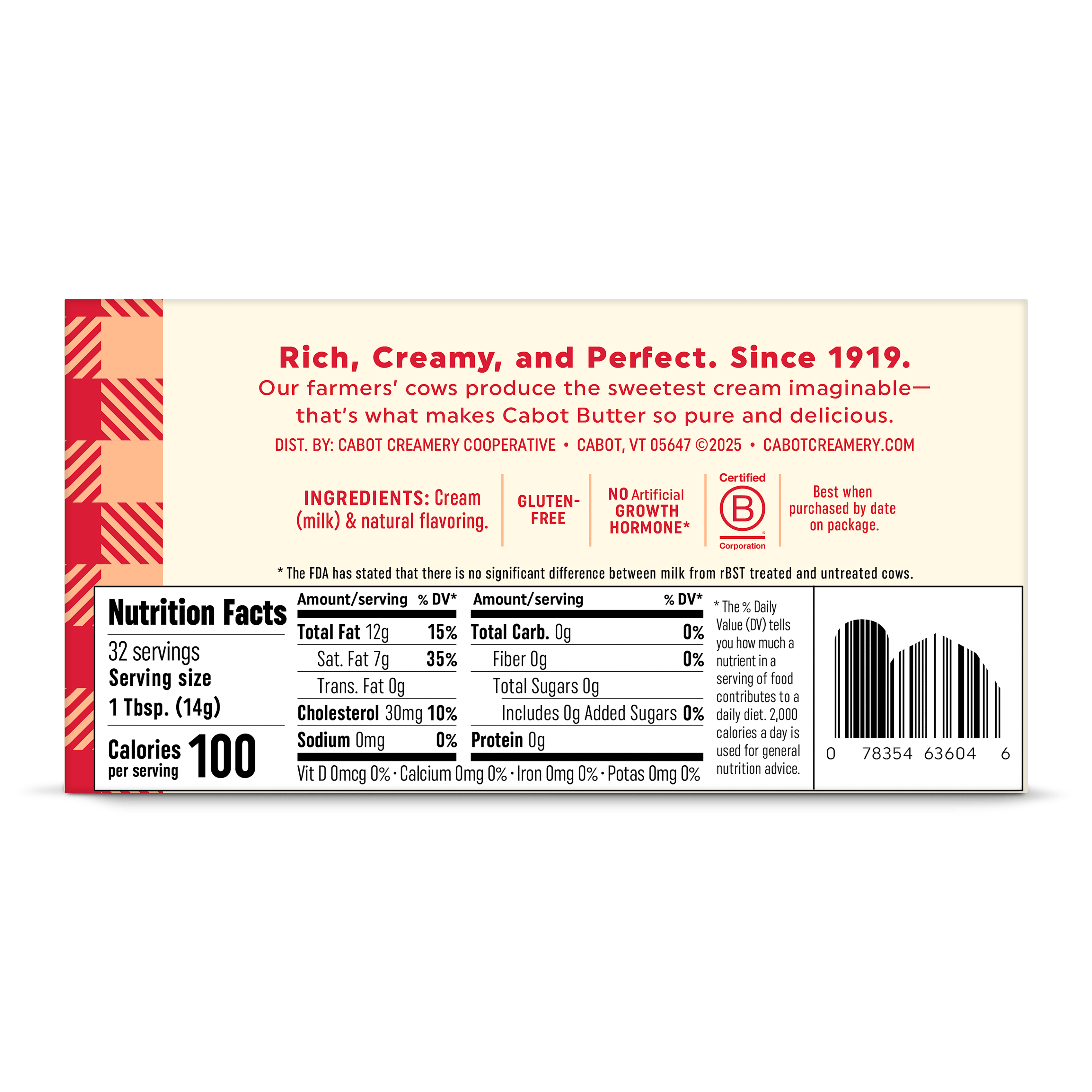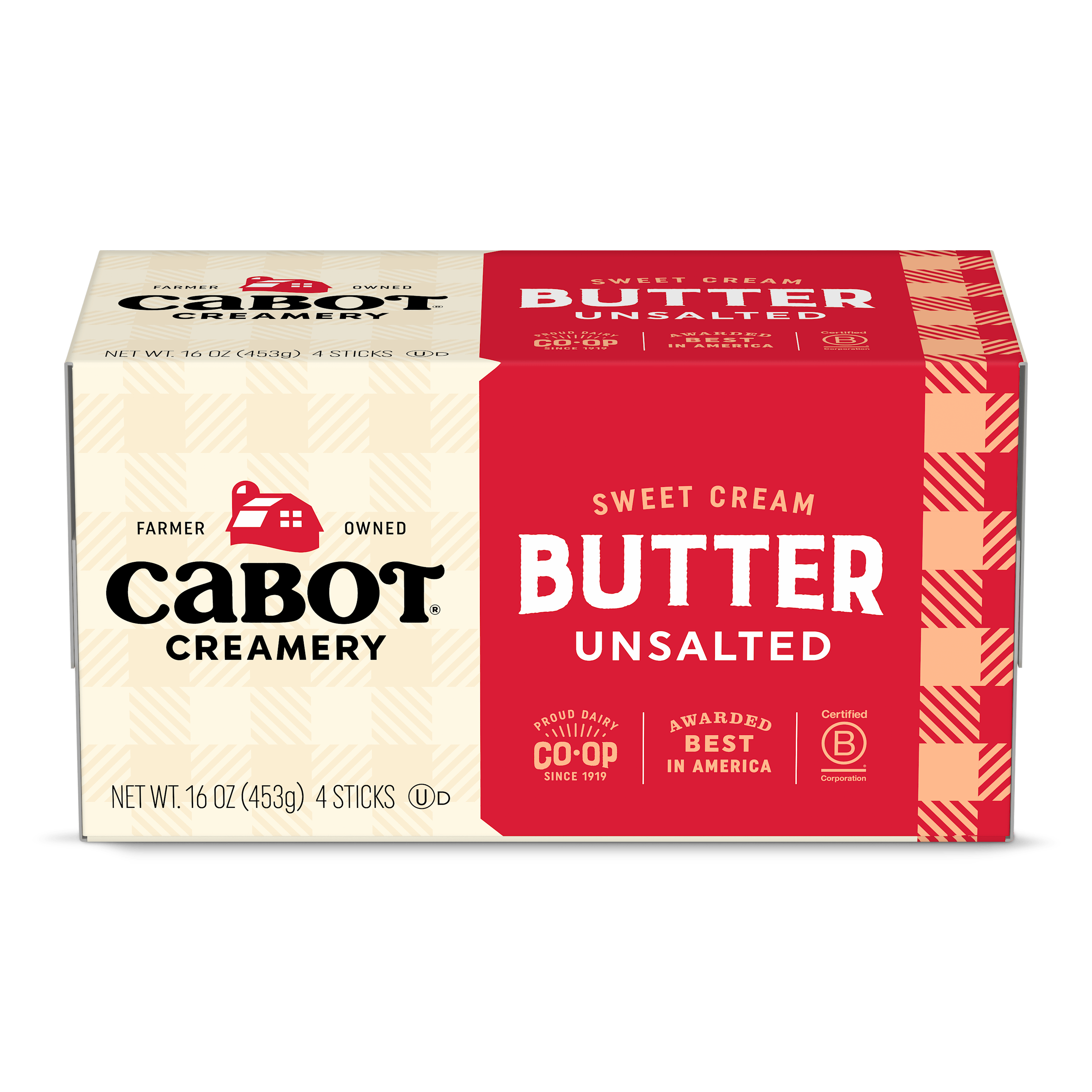 A 16 oz box of Cabot Creamery Salted Butter features a beige and blue plaid design, “Farmer Owned” logo, and text noting it includes 4 sticks of award-winning butter made by America's Best Butter makers.