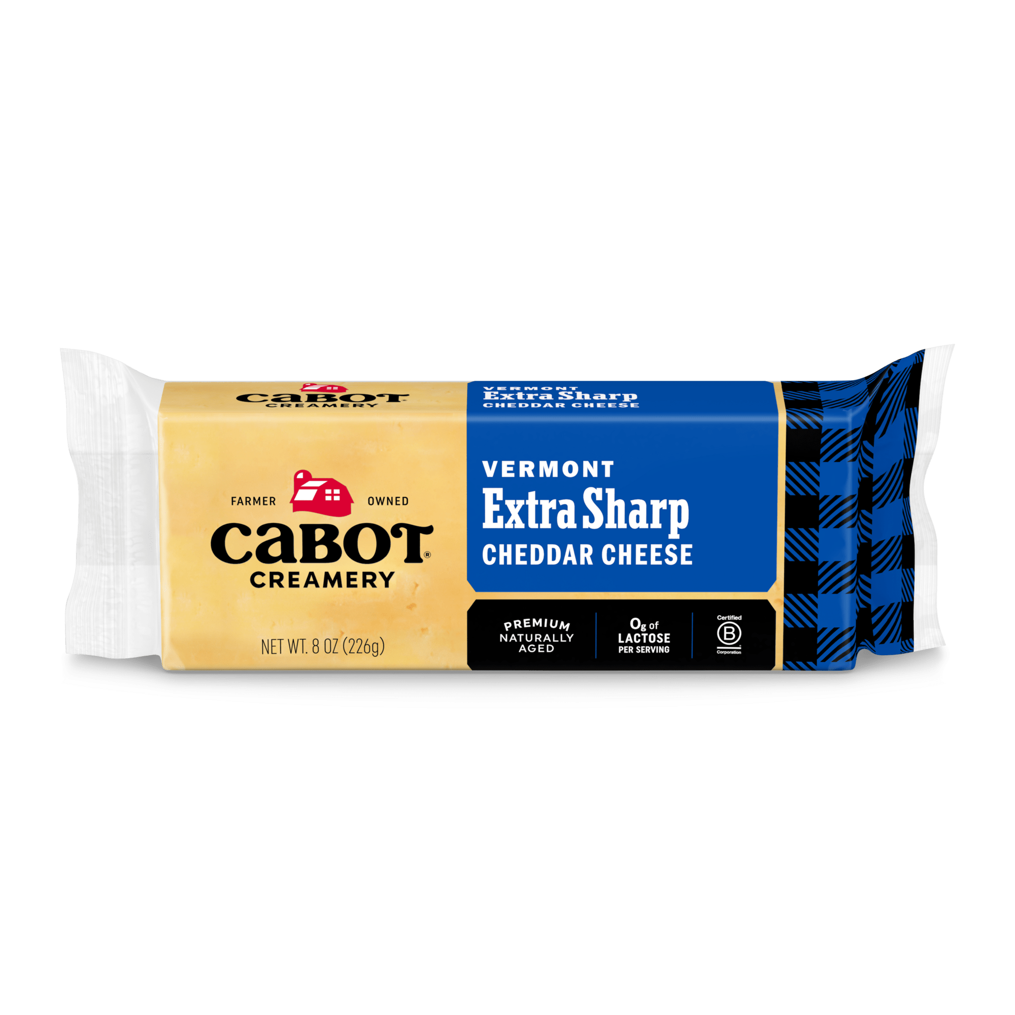 Cabot Creamerys Extra Sharp Cheddar Cheese, aged 12 months, is lactose-free with a red barn logo highlighting Naturally Aged and Farmers Owned. This yellow cheese is packaged in an 8 oz (226g) size, ideal for cheddar enthusiasts.