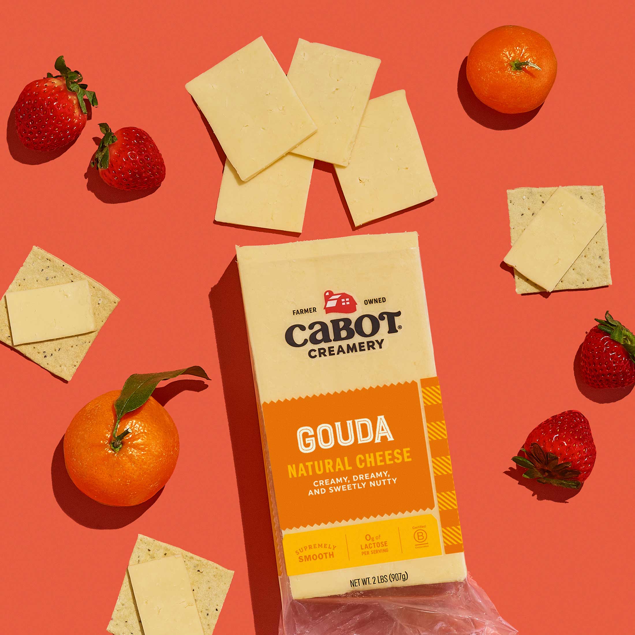 Cabot Creamery Gouda Cheese comes in a clear plastic container with 26 cracker cut slices and an orange and beige label—ideal for protein-rich, nutritious snacking.