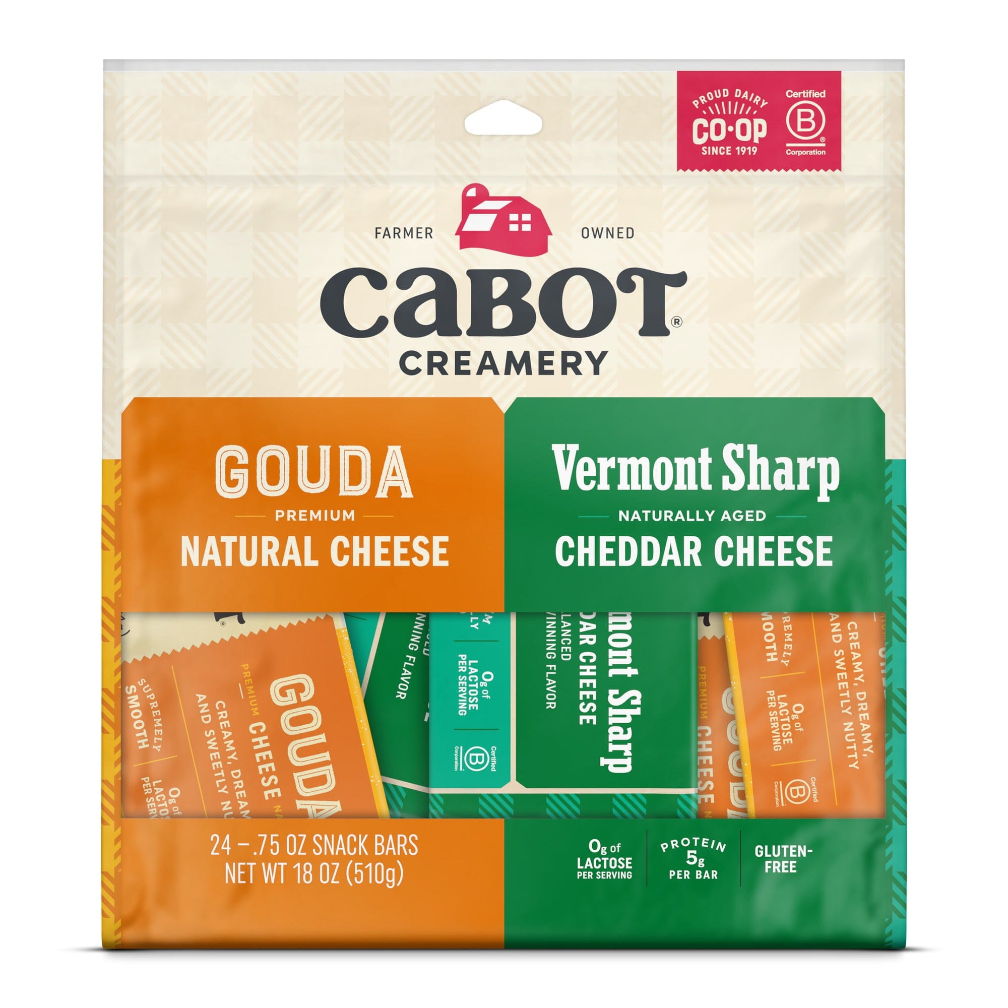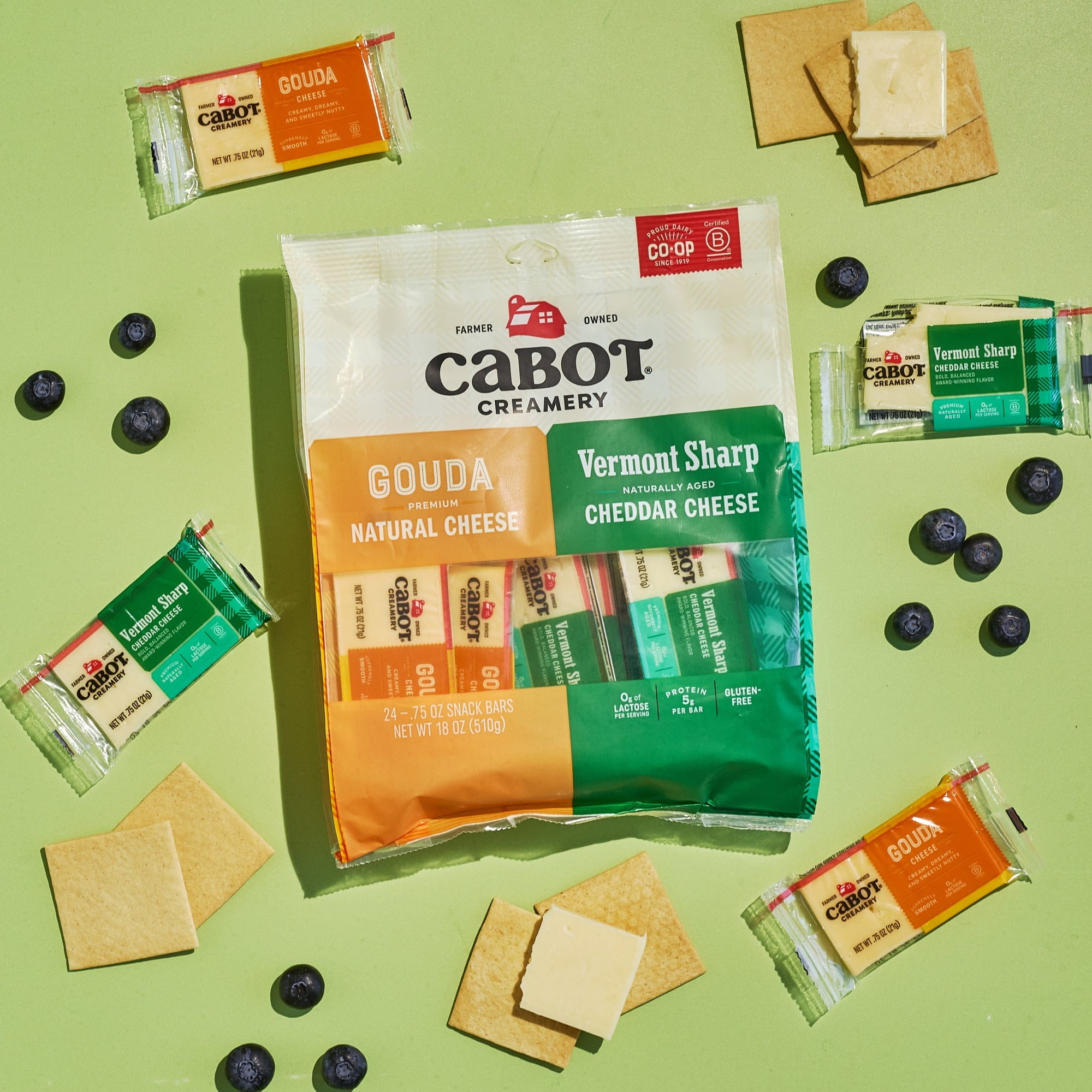 Cabot Creamerys Seriously Sharp Cheddar Cheese snack bars, ideal for charcuterie boards, come in a red plaid bag holding eight 0.75 oz bars. The lactose-free cheese is farmer-owned, B corporation certified, and perfect for cheese lovers.
