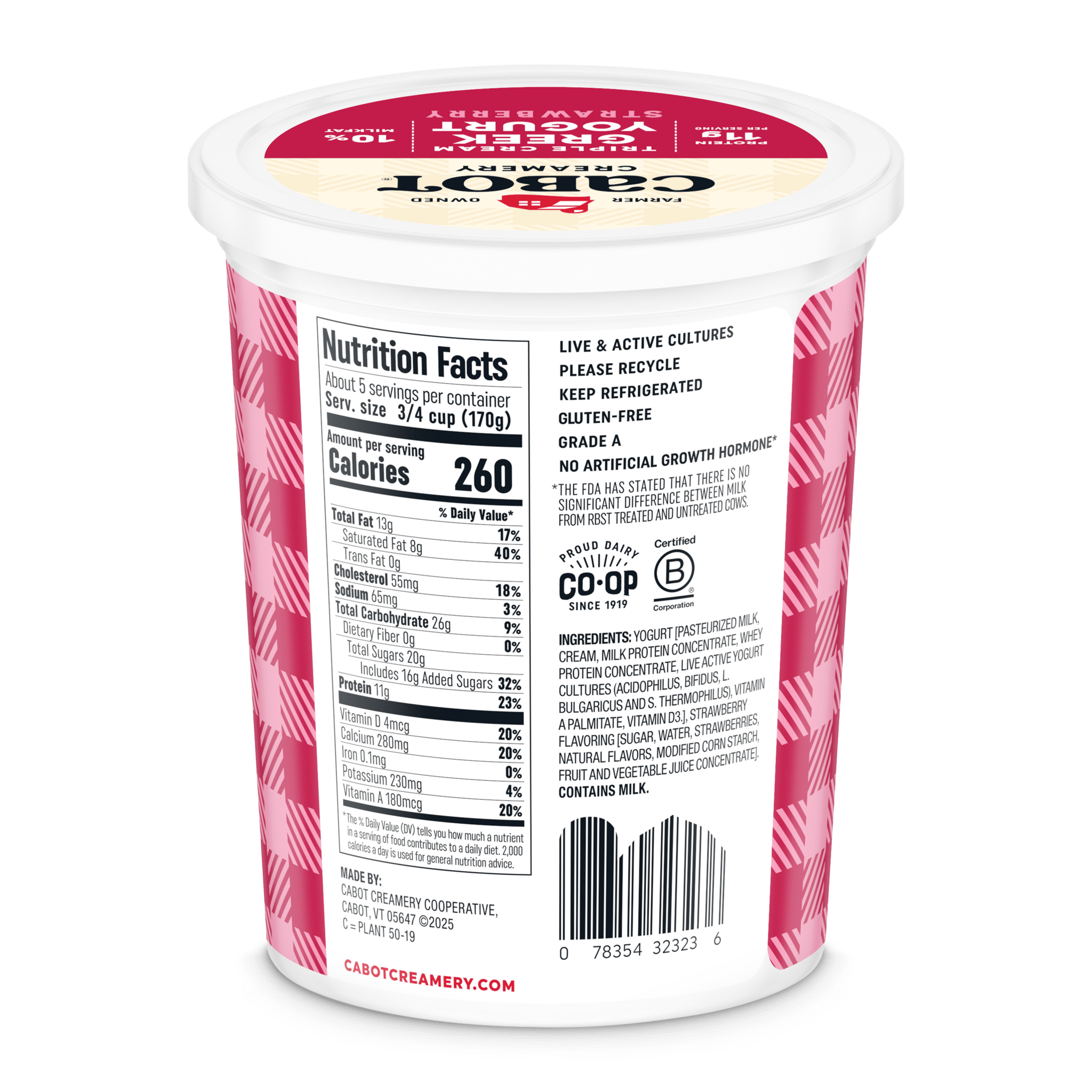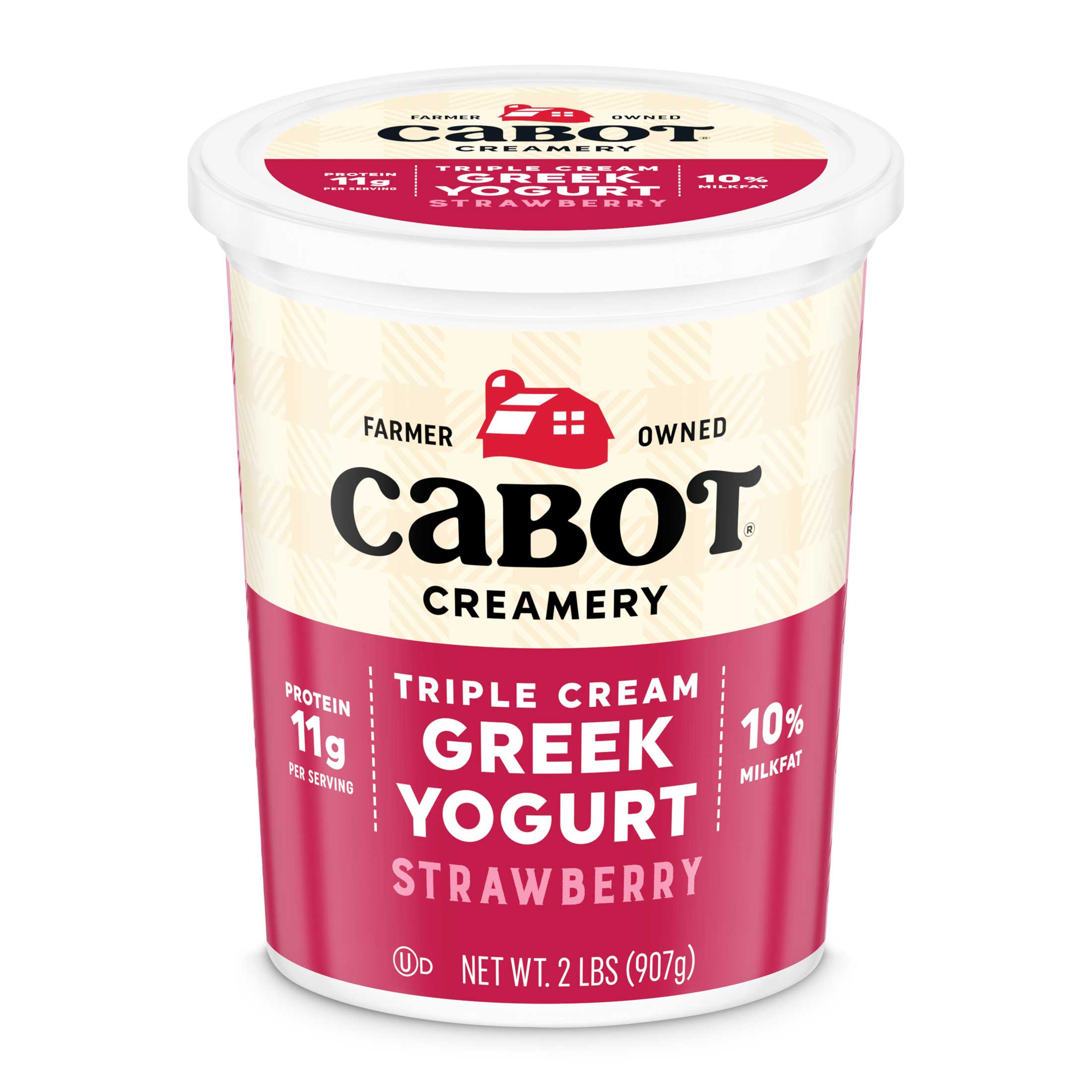 Cabot Creamery Triple Cream Vanilla Bean Greek Yogurt comes in a 2-pound container with a yellow and white label, featuring the Cabot logo, and provides 11g protein and 10% milkfat per serving.